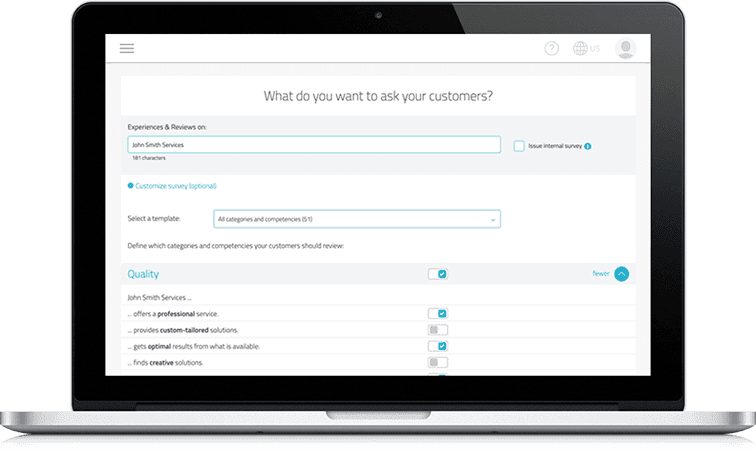 Pas uw enquête aan aan de specifieke behoeften van uw bedrijf en kies uit maximaal 60 vragen om feedback op maat te krijgen die relevant is voor uw klantenbestand.