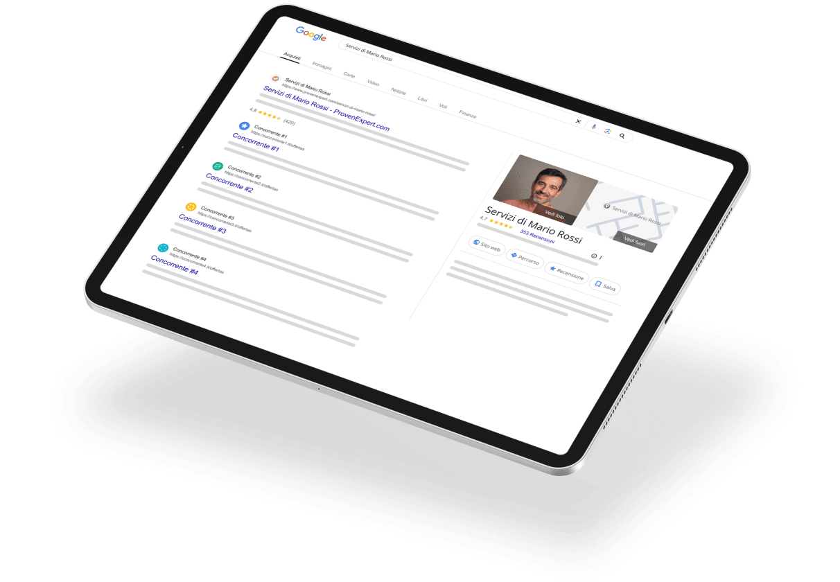 Il vostro profilo ProvenExpert è automaticamente ottimizzato per i motori di ricerca come Google, per assicurarvi che i potenziali clienti vi trovino facilmente rispetto alla concorrenza. Ottenete una maggiore visibilità, più clic e più nuovi clienti con le valutazioni a stelle di Google elencate nel vostro profilo ProvenExpert, nelle vostre inserzioni su Google e sul vostro sito web.